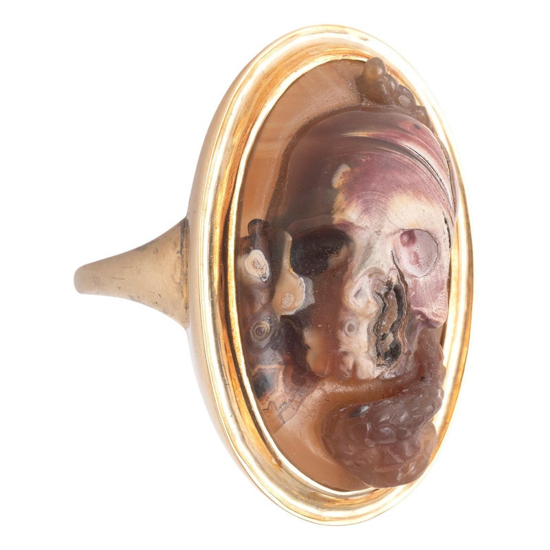 The agate cameo, probably of Italian manufacture and datable to the first half of the nineteenth century, depicts a Memento Mori, literally a Latin phrase that reads "Remember that you must die" which, however macabre it may seem, is actually a phrase dating back to Ancient Rome that invites a reflection on the transience of life, in order not to lose the true meaning of life and live in a more present way, moving away from the mere possession of earthly goods, which are of no use to the afterlife.