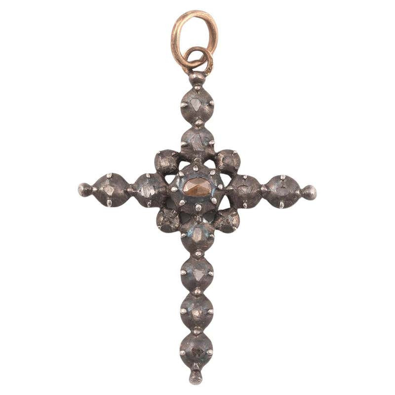 A Georgian diamond-set cross pendant, consisted of fiftheen old rose-cut diamonds forming a Latin cross, the diamonds with foiled back set to cut-down collets, all set in silver to rose gold back, with gold pendant loop, circa 1800, unmarked, tested as silver and 18ct gold, measuring 4 x 3 cm, gross weight 3.9 grams. This antique pendant is in very good condition with signs of wear consistent with its age. Unmarked, tested as silver and 18ct gold.