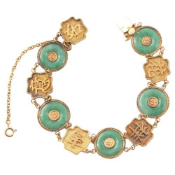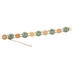 Flexible bracelet, composed of jadeite jade discs alternated with quadrilobed links in guilloché yellow gold surmounted by Chinese characters. Length: 19.5cm. Weight: 14.8g.
