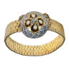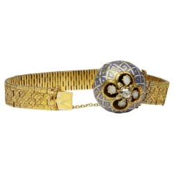 The Russian manufacturing bracelet dates to 1843 and is designed as a semi-rigid band, composed by a series of small rectangular links – decorated by an engraved geometric and floral motif – which permits the bracelet to best adapt to the wrist. The upper part, however, is characterized by a hemispherical ornament, decorated by a geometric motif with blue enamels, in the centre of which there is a floral motif that recalls the workmanship of the strap. In the centre there is an antique European cut diamond, enhanced with four opals which, creating an ideal four-leaf clover, give greater light and preciousness to the object. The closure, completely invisible, is located on the side of the central decoration and is ensured with a small and equally imperceptible chain. The bracelet also holds the manufacturer’s trademark: IE, which is identified as a Moscow trademark that confirms the eighteen century’s Russian manufacture attribution.