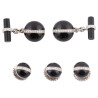 Each cufflink of circular design with central diamond line detail, three buttons en suite, circa 1930, in beige filt fitted case.
