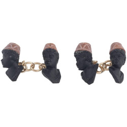 Pair of cufflinks designed as carved coral fish. Chain link connections with onyx baton. Mounted in 18Kt yellow gold