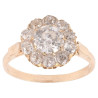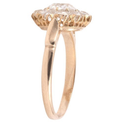 Of stylised flowerhead design, the central old European-cut diamond weighing approx. 1,5 Carats, claw-set, to an old-cut diamond cluster surround composed by 10 stones weighing approx. 1 Carats, with fluted shoulders and plain hoop, mounted in yellow gold.