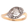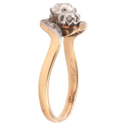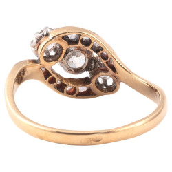 A crossed ring in 18K yellow gold and silver centered by three old mine cut diamonds approx. 0.50 carat, underlined by two lines of rose-cut diamonds.