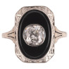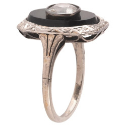 The ring has an oval flat onyx, in the center of which you find a round diamond cut old about 1 ct, in a platimun setting.