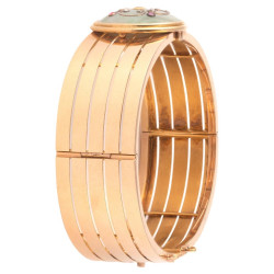 Articulated bracelet in 18kt yellow gold centered with a large cabochon of jade with floral motif with rose cut diamonds and rubies. Diameter 5.8 cm Circa 1870's Gross weight: 30.5g.