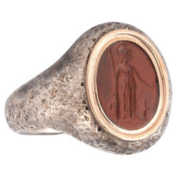 The jasper intaglio is attributable to the Roman production of the 2nd century and has an engraving depicting Minerva, goddess of wisdom and right war, as well as protector of artisans thanks to the cult that spread among the Etruscans. Here the goddess is presented with the attributes that make her typically recognizable, including the crested helmet, a long spear that connotes her as a warrior goddess and protector and, finally, a pàtera (or phiale), which is a cup used to offer drinks during ritual sacrifices.