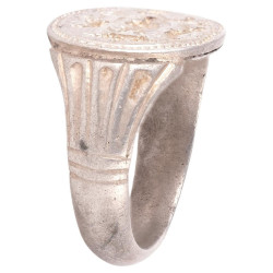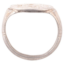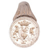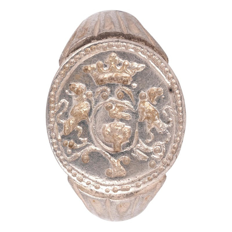 The silver ring, from the Tudor era, can be dated to the seventeenth century when the signet rings were both a symbol of the owner’s social status and extremely personal objects used as tools for authenticating messages and documents. Each representation of these signets, in fact, is unique and personalized with identifying elements of the owner. In this case the seal has an articulated decoration with two lateral climbing lions that enclose in the center a small bird placed on a support, all surmounted by a crown and enclosed within a decorative border. This ring can be compared to a seal kept at the British Museum (1928,0507.1).