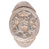 L’anello in argento, di epoca Tudor, è databile al XVII secolo quando gli anelli con sigillo erano sia simbolo del ceto sociale del possessore, sia oggetti estremamente personali utilizzati come strumenti per autentificare messaggi e documenti. Ogni raffigurazione di questi sigilli, infatti, è unica e personalizzata con elementi identificativi del proprietario. In questo caso il sigillo presenta una decorazione articolata con due leoni rampanti laterali che racchiudono al centro un uccellino posato su un appoggio, il tutto sormontato da una corona e racchiuso all’interno di un bordo decorativo. Questo anello è possibile confrontarlo con un sigillo conservato presso il British Museum (1928,0507.1).