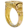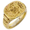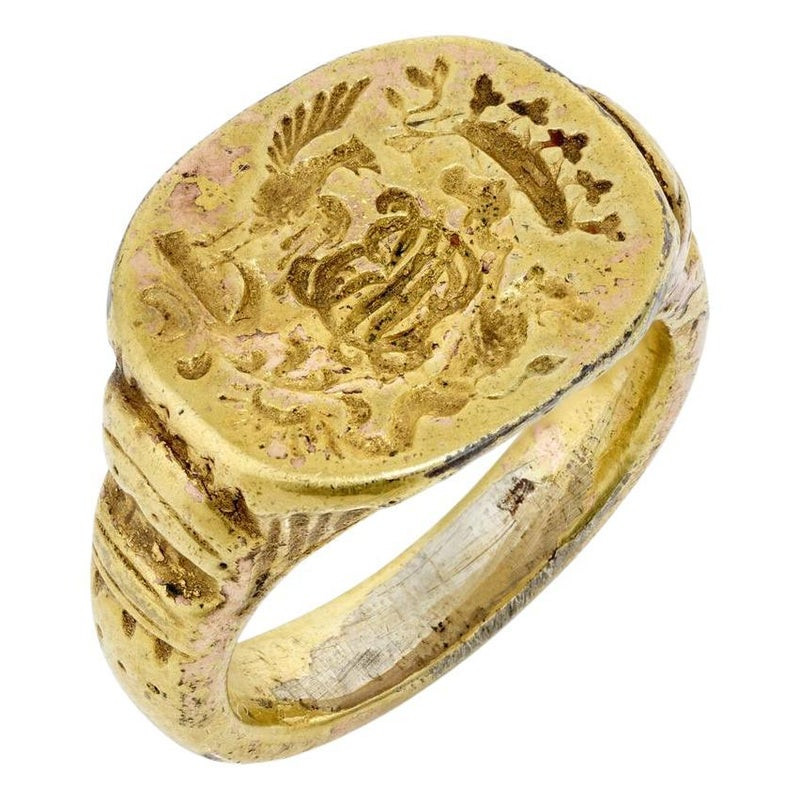 L’anello con sigillo del XVIII secolo è realizzato in argento dorato, il gambo è adornato da delle decorazioni e presenta dei segni che contribuiscono ad aumentare il valore simbolico dell’oggetto, testimoniando la sua importanza in epoche passate. Nella parte superiore si scorgono dei blasoni che, indubbiamente, fanno riferimento all’origine nobiliare del committente dell’anello: da una parte si scorge un leone rampante, figura ricorrente negli stemmi e simbolo di valore, dominio, nobile eroismo ma anche di coraggio e magnanimità; al centro si scorgono due lettere sovrapposte, presumibilmente HB; dall’altro lato, invece, si riconosce l’immagine di un gallo, il quale va ad avvalorare il significato di cui è portatore il leone, ovvero il coraggio, sebbene sia altresì emblema della vigilanza. Al centro, nella parte alta, invece, si scorge una corona a cinque punte che indica lo status sociale del proprietario e della sua famiglia.