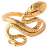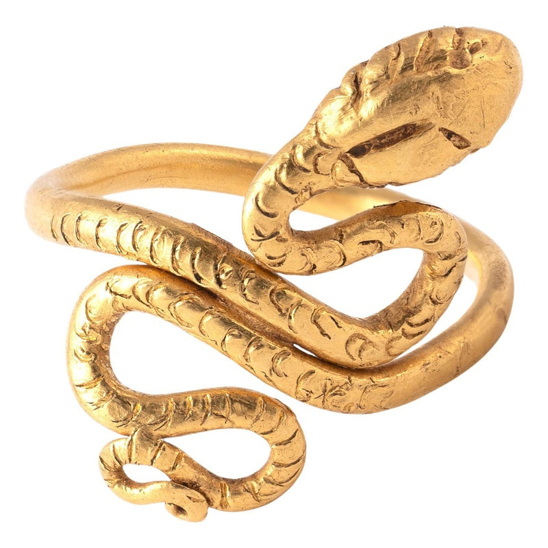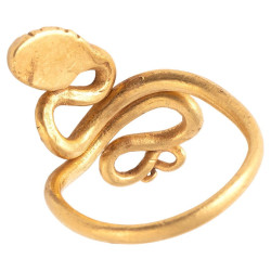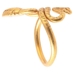 The Roman ring, dating between the 2nd and 3rd centuries, is made of 22-carat gold. It is a high quality ring, as can be seen from the forging of the animal's body and head, which is in excellent conservative conditions. The serpent was a particularly iconography common already in ancient Greek, when it was associated with the Agathodaimon (lit. good Demon), whose numen was the serpent itself, with which it showed itself to people to indicate its presence and, therefore, was a bearer of good fortune. This symbol, however, also found confirmation in Roman times, where the Agathodaimon is seen as a genius loci, therefore, a divine entity linked to a place and this is how the serpent took on a well-wishing and talismanic function, before taking on a negative connotation in the Christian and modern era.