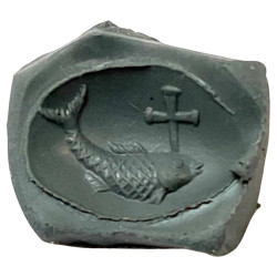 L’anello paleocristiano del IV secolo presenta una montatura in oro a 22 carati e un intaglio in ametista raffigurante un pesce sormontato da una croce. Il pesce rappresenta tradizionalmente un simbolo cristiano, poiché il termine greco ICTHYS è stato utilizzato come acronimo dai primi cristiani per riferirsi a Gesù Cristo e la presenza della croce rafforza tale identificazione. Questa iconografia ha avuto particolare diffusione durante le persecuzioni, periodo in cui i cristiani ricorrevano spesso ad anelli con tali simboli per riconoscersi reciprocamente, evitando di destare sospetti e tutelando così la propria sicurezza.