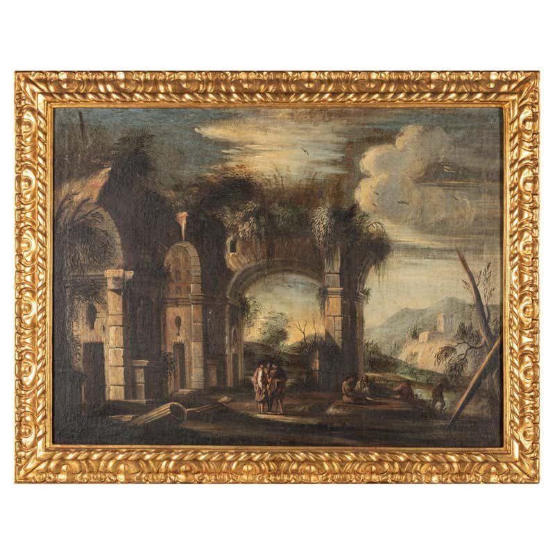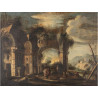 Follower of Giovanni Ghisolfi Scholars conversing amongst classical ruins oil on canvas.