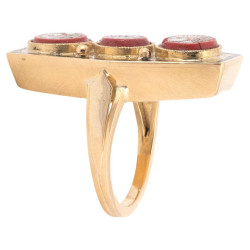 Rare 18ct gold hexagonal-shaped ring with three micromosaics set on red glass depicting two birds and a one depicting black beetle, all surrounded by black enamel. Italian manufacture, probably Rome late 18th century early 19th century, 1790/1800. Dimensions 3,2 x 2.5 cm approx. Ring size 7