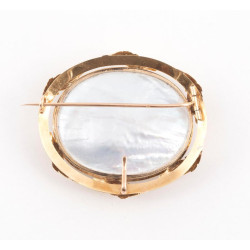 The set has a bracelet with five oval micromosaics depicting Roman ruins framed by a plain motif and joined by links and an "en suite" brooch, in their original case from the late 19th century, with Mother-of-pearl on the back.