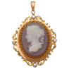 PENDANT CAMEO, the setting in 750 / °° yellow gold braided and chiseled decorated with foliage punctuated with cultured pearls surrounding a woman in profile on agate, her hair richly chiseled and styled in the antique style. End of the 19th century. 5 x 4 cm without bail. Gross weight: 17.7 g.