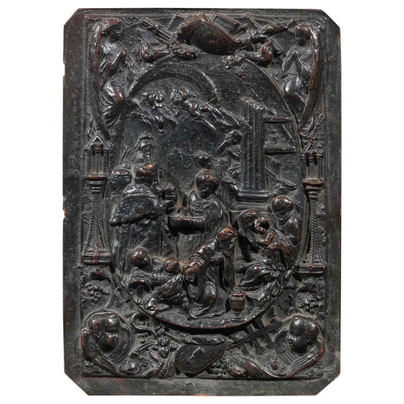 19th Century Italian Patinated Bronze Relief Plaque of the Nativity