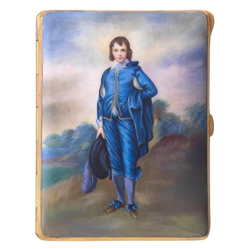 Of rectangular form, the hinged cover enameled depicting a young gentleman with 18th century clothes in a rural landscape.