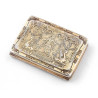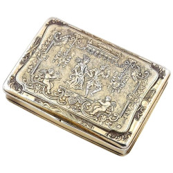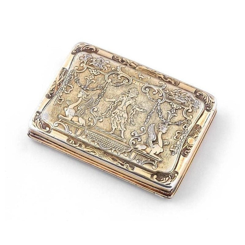 Germany, circa 1740 Of rectangular shape, the hinged cover and the base with finely-chased Renaissance taste decorations and scenes of dancers with putti, trophies and fantastic animals. German and maker's mark initials. Dimensions: 8 x 5.5 cm.