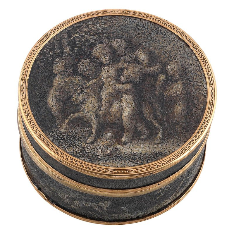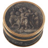 The cover set with three putti amidst clouds painted en grisaille, set in the lid of a gilt-mounted tortoiseshell box. Circular, 63mm dia.