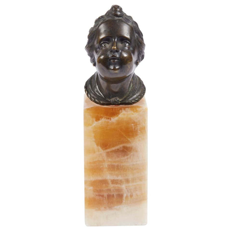 Made in bronze in the shape of a putto face, 8 x 5.5 x 5 cm, on a parallelepiped base in non-pertinent alabaster, 9.6 x 5 x 5 cm.